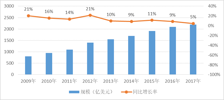 在全球信息化浪潮的強(qiáng)勁推動(dòng)下,軟件產(chǎn)業(yè)已發(fā)展成為全球規(guī)模最大、最具活力的產(chǎn)業(yè)。 2009年,全球軟件外包規(guī)模為800億美元,到2017年,全球軟件外包規(guī)模達(dá)到2200億美元。全球軟件外包產(chǎn)業(yè)高速增長(zhǎng)后,目前增速有所放緩,增速仍接近10%。
