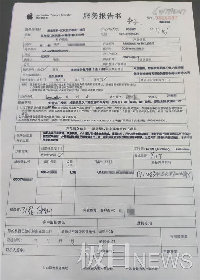“本以為國際知名品牌的產(chǎn)品很靠譜,沒想到用了一個月就成了‘定時炸彈’!” 9月18日,站在美成高科武漢世紀(jì)都市廣場店的維修柜臺前,齊女士怒不可遏。面對這位蘋果指定維修商,雖然她極力解釋,但店家始終堅稱其送修的蘋果M1處理器Air筆記本的屏幕裂痕是人為造成的,而且維修費(fèi)更貴。超過3000元必須由公司支付。齊女士個人負(fù)責(zé)。